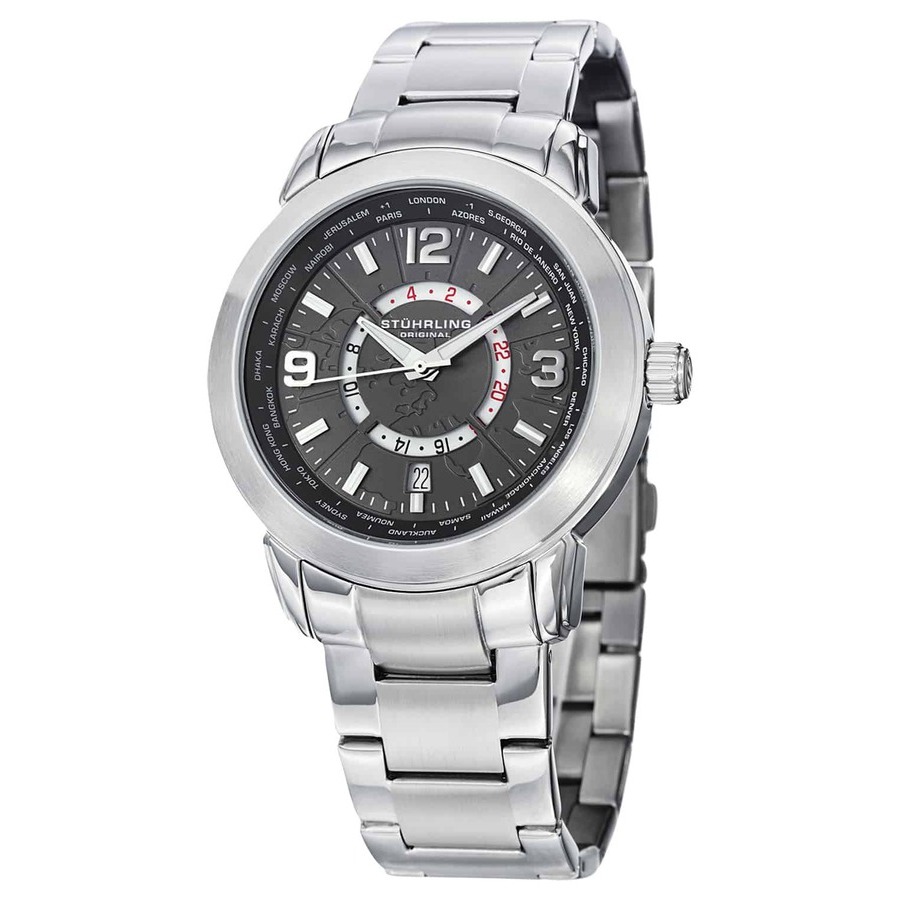 Silver-tone stainless steel case and bracelet. Fixed silver-tone stainless steel bezel. Grey dial with silver-tone hands and Arabic numeral hour markers. Minute markers around the outer rim. Dial Type: Analog. Luminescent hands and markers. Date display at the 6 o'clock position. Quartz movement. Scratch resistant mineral crystal. Pull / push crown. Solid case back. Round case shape, case size: 42 mm, case thickness: 10 mm. Deployment with push button release clasp. Water resistant at 50 meters / 165 feet. Functions: date, hour, minute, second. Symphony Series. Dress watch style. Stuhrling Original Symphony Grey Dial Mens Watch M15367.