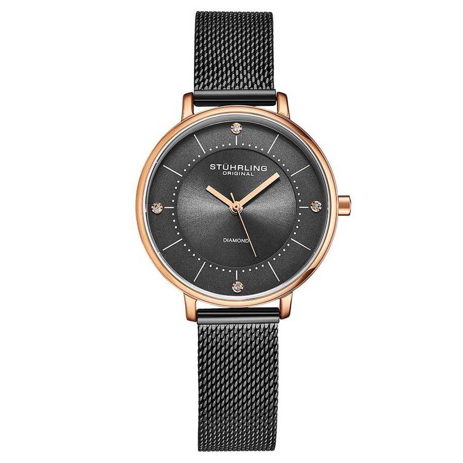 Add stunning elegance to any outfit with the lightweight and comfortable Almasi. Rose gold-tone alloy case with a black stainless steel bracelet. Fixed rose gold-tone alloy bezel. Gunmetal dial with rose gold-tone hands and index hour markers. Minute scale around the inner rim. Dial Type: Analog. Quartz movement. Scratch resistant mineral crystal. Pull / push crown. Solid case back. Round case shape, case size: 34 mm, case thickness: 7 mm. Fold over clasp. Water resistant at 50 meters / 165 feet. Functions: hour, minute, second. Symphony Series. Dress watch style. Stuhrling Original Symphony Gunmetal Dial Ladies Watch M15750.