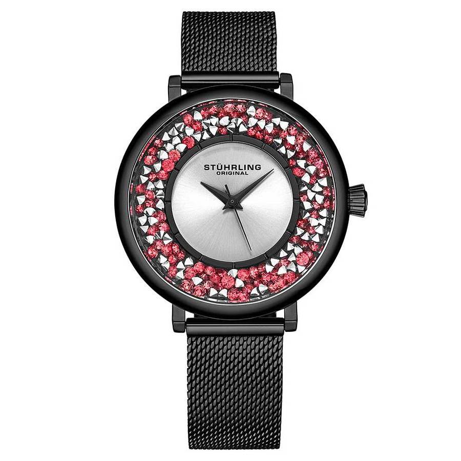 Black alloy case with a black stainless steel bracelet. Fixed black alloy bezel. Silver-tone dial with black hands and index hour markers. Dial Type: Analog. Quartz movement. Scratch resistant mineral crystal. Pull / push crown. Solid case back. Round case shape, case size: 38 mm, case thickness: 7 mm. Fold over clasp. Water resistant at 50 meters / 165 feet. Functions: hour, minute, second. Symphony Series. Dress watch style. Stuhrling Original Symphony Silver-tone Dial Ladies Watch M15461.