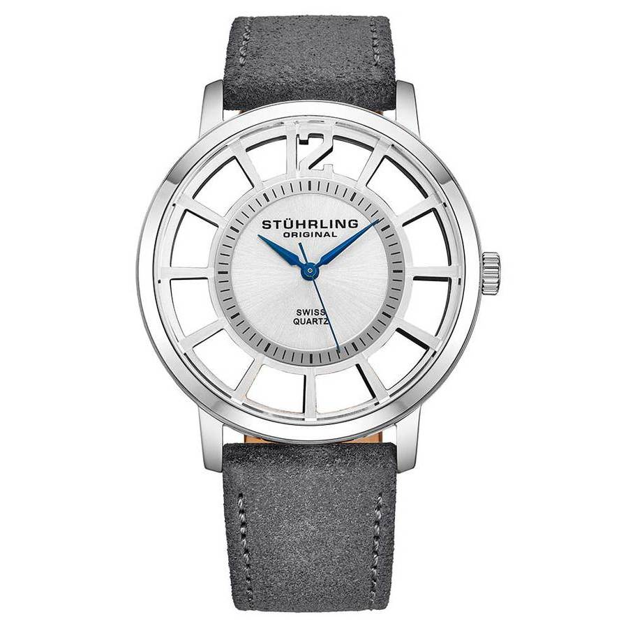 Stainless steel case with a grey leather strap. Fixed stainless steel bezel. Silver dial with blue hands and index hour markers. Arabic numeral appears at the 12 o'clock position. Minute markers aroundan inner ring. Dial Type: Analog. Quartz movement. Scratch resistant mineral crystal. Pull / push crown. Transparent case back. Round case shape. Case size: 40 mm. Case thickness: 8 mm. Band width: 20 mm. Tang clasp. Water resistant at 50 meters / 165 feet. Functions: hour, minute, second. Symphony Series. Dress watch style. Watch label: Swiss Movt. Stuhrling Original Symphony Silver Dial Grey Leather Mens Watch M15260.