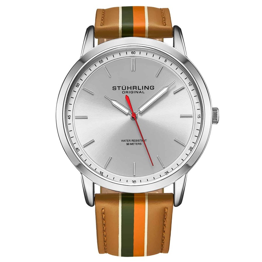 An instant classic; the Stuhrling Quartz Classic features syringe hands paired within a thin 7.5mm case for that timeless look with a modern twist. Choose your look with five different leather strap designs. Silver-tone alloy case with a tan leather strap. Fixed silver-tone alloy bezel. Silver-tone dial with silver-tone hands and index hour markers. Minute markers around the outer rim. Dial Type: Analog. Quartz movement. Scratch resistant mineral crystal. Pull / push crown. Solid case back. Round case shape, case size: 44 mm, case thickness: 7 mm. Buckle clasp. Water resistant at 50 meters / 165 feet. Functions: hour, minute, second. Symphony Series. Dress watch style. Stuhrling Original Symphony Silver-tone Dial Mens Watch M15916.