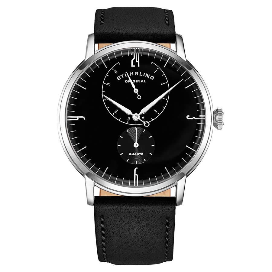 Silver-tone alloy case with a black leather strap. Fixed silver-tone alloy bezel. Black dial with silver-tone alpha-style shape hands and index hour markers. Minute markers around the outer rim. Dial Type: Analog. Two - seconds, 24 hour subdials. Quartz movement. Scratch resistant mineral crystal. Pull / push crown. Solid case back. Round case shape, case size: 42 mm, case thickness: 9 mm. Band length: 8.5 inches. Buckle clasp. Water resistant at 50 meters / 165 feet. Functions: hour, minute, second, 24 hour. Dress watch style. Stuhrling Original Symphony Quartz Black Dial Mens Watch M13663.