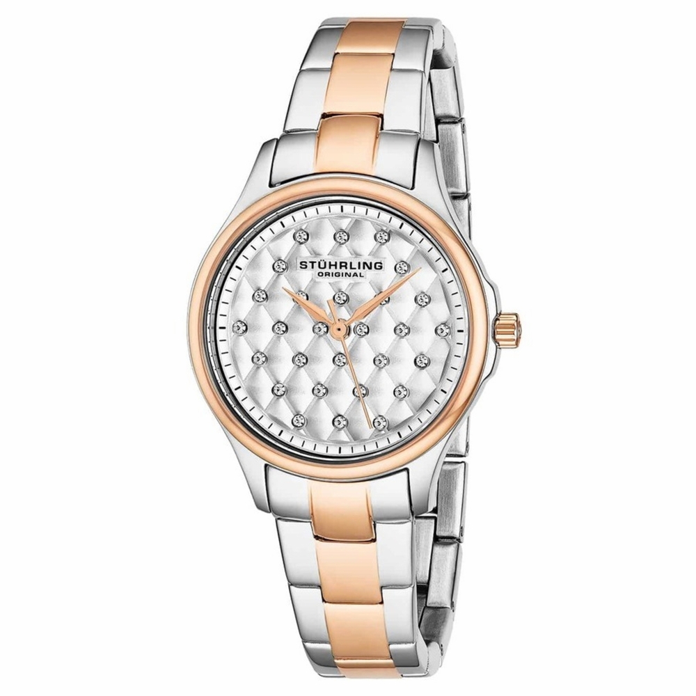 Silver-tone stainless steel case and bracelet. Fixed rose gold-tone stainless steel bezel. White dial with rose gold-tone hands and index hour markers. Minute markers around the outer rim. Dial Type: Analog. Quartz movement. Scratch resistant mineral crystal. Pull / push crown. Solid case back. Round case shape, case size: 36 mm, case thickness: 8 mm. Deployment with push button release clasp. Water resistant at 50 meters / 165 feet. Functions: hour, minute, second. Symphony Series. Dress watch style. Stuhrling Original Symphony White Dial Ladies Watch M15323.