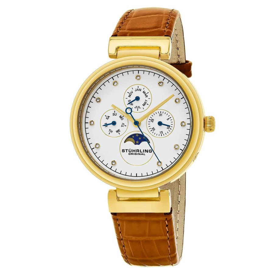 Yellow gold-tone stainless steel case with a orange leather strap. Fixed yellow gold-tone stainless steel bezel. White dial with yellow gold-tone hands and index hour markers. Minute markers around the outer rim. Dial Type: Analog. Date display at the 3 o'clock position. Quartz movement. Scratch resistant mineral crystal. Pull / push crown. Solid case back. Round case shape, case size: 39 mm, case thickness: 10 mm. Buckle clasp. Water resistant at 50 meters / 165 feet. Functions: month, date, day, hour, minute, second. Symphony Series. Dress watch style. Stuhrling Original Symphony White Dial Ladies Watch M15390.