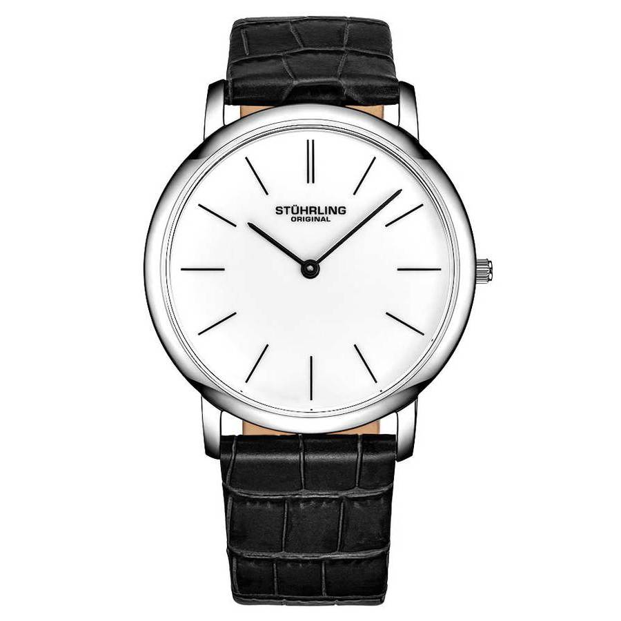 Silver-tone stainless steel case with a black leather strap. Fixed silver-tone stainless steel bezel. White dial with black hands and index hour markers. Dial Type: Analog. Quartz movement. Scratch resistant mineral crystal. Pull / push crown. Solid case back. Round case shape, case size: 38 mm, case thickness: 6 mm. Buckle clasp. Water resistant at 30 meters / 100 feet. Functions: hour, minute. Symphony Series. Dress watch style. Stuhrling Original Symphony White Dial Mens Watch M15349.
