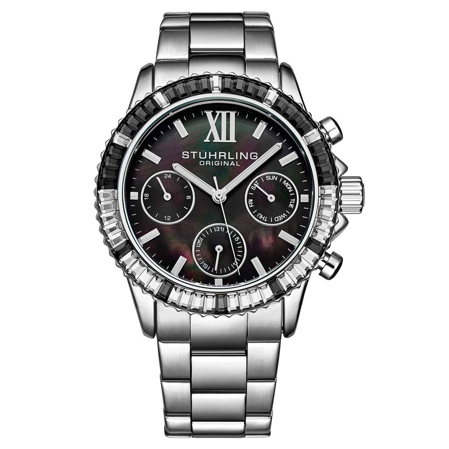 Ladies Chrono Silver Case, Silver and Black Bezel, Black MOP Dial, Silver Hands and Markers, Silver Bracelet Watch Silver-tone alloy case with a silver-tone stainless steel bracelet. Uni-directional rotating black and white alloy bezel. Black dial with silver-tone hands and index hour markers. Minute markers around the outer rim. Dial Type: Analog. Date display at the 6 o'clock position. Quartz movement. Scratch resistant mineral crystal. Screw down crown. Solid case back. Round case shape, case size: 39 mm, case thickness: 10 mm. Deployment with push button release clasp. Water resistant at 50 meters / 165 feet. Functions: date, day, hour, minute, second. Vogue Series. Fashion watch style. Stuhrling Original Vogue Black Dial Ladies Watch M15800.
