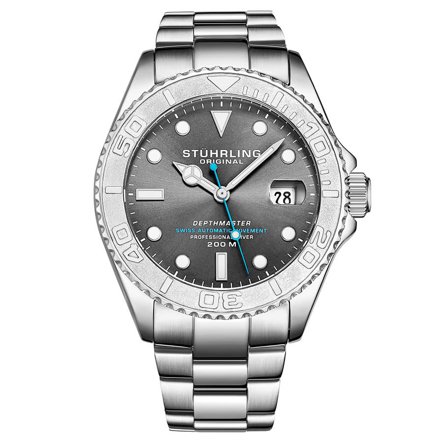 Silver-tone stainless steel case with a silver-tone stainless steel bracelet. Uni-directional rotating 120 click silver-tone stainless steel bezel. Grey dial with silver-tone Mercedes-logo, sword, and Breguet-style shape hands and index hour markers. Minute markers around the outer rim. Dial Type: Analog. Luminescent hands and markers. Date display at the 3 o'clock position. Claro Calibre CL888 Automatic movement, containing 18 Jewels, bitting at 21600 vph, and has a power reserve of approximately 38 hours. Scratch resistant krysterna crystal. Screw down crown. Transparent case back. Round case shape, case size: 42 mm, case thickness: 14 mm. Band length: 8 inches. Fold over with safety release clasp. Water resistant at 200 meters / 660 feet. Functions: date, hour, minute, second. Dive watch style. Watch label: Swiss Movt. Stuhrling Original Aquadiver Automatic Grey Dial Mens Watch Stuhrling Original Aquadiver Automatic Grey Dial Mens Watch M13537