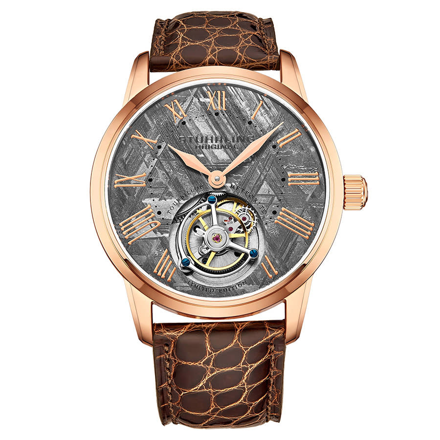 Rose gold-tone stainless steel case with a brown (alligator) leather strap. Fixed rose gold-tone bezel. Meteorite (tourbillon display) dial with rose gold-tone diamond-style hands and Roman numeral hour markers. Dial Type: Analog. Hand wind movement. Scratch resistant sapphire crystal. Pull / push crown. Transparent case back. Round case shape. Case size: 40 mm. Case thickness: 13 mm. Band width: 20 mm. Band length: 9.5 inches. Deplayment with push button release clasp. Water resistant at 50 meters / 165 feet. Functions: hour, minute, tourbillon. Luxury watch style. Stuhrling Original Tourbillon Hand Wind Mens Watch M13673.