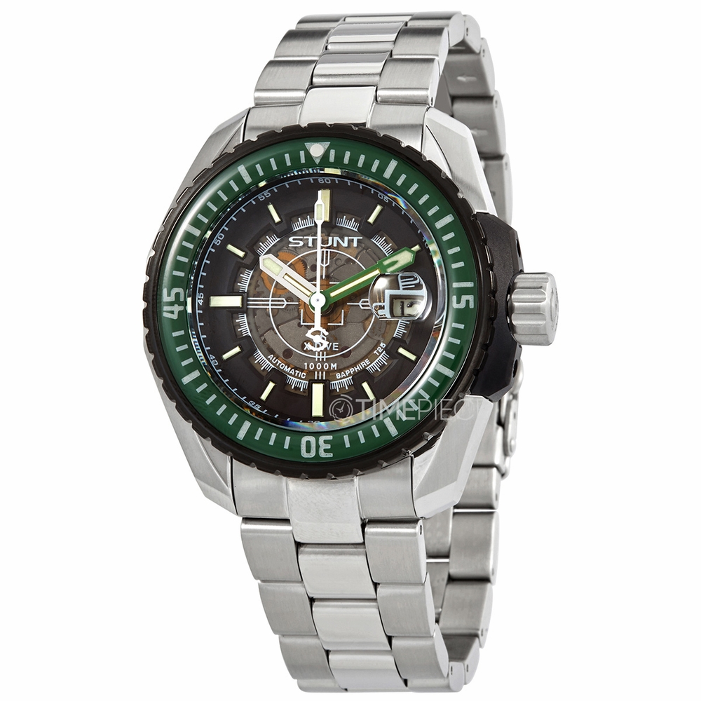 Stainless steel case with a stainless steel bracelet. Uni-directional rotating stainless steel bezel with an inlaid green ring. Black (skeleton center) dial with luminous silver-tone and green hands and index hour markers. Arabic numeral minute markers (at 5 minute intervals). Minute markers around the outer rim. Dial Type: Analog. Luminescent hands and markers. Date display at the 3 o'clock position. Automatic movement. Scratch resistant sapphire crystal. Screw down crown. Solid case back. Round case shape. Case size: 45.5 mm. Case thickness: 16.3 mm. Band width: 22 mm. Band length: 8.5 inches. Fold over with double push button release clasp. Water resistant at 1000 meters / 3300 feet. Functions: date, divers watch, sport, water resistant. The Halocline Series. Dive watch style. STUNT The Halocline Automatic Black Skeleton Dial Mens Watch ST-02 SGS.