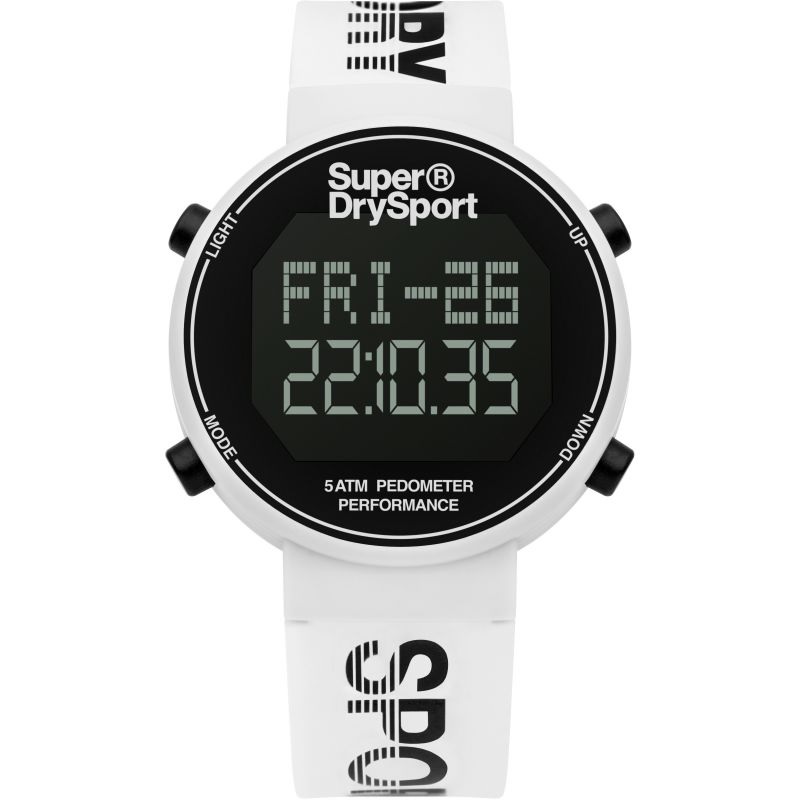White plastic (resin) case with a white rubber strap. Fixed white plastic (resin) bezel. Black digital dial displaying: hours, minutes, seconds day of the week and date. Dial Type: digital. Chronograph - sub-dials displaying: digi pedometer. Quartz movement. Scratch resistant mineral crystal. Pull / push crown. Solid case back. Round case shape. Case size: 40 mm. Case thickness: 11 mm. Band width: 20 mm. Tang clasp. Water resistant at 50 meters / 165 feet. Functions: chronograph, day, date, hour, minute, second, pedometer, 50 day data record, calorie count, mileage, stride length, stopwatch, 12/24 hour format, countdown timer and 2 alarm groups. Digi Pedometer Series. Sport watch style. Watch label: Japan Movt. Superdry Digi Pedometer Alarm Chronograph Quartz Digital Black Dial Unisex Watch SYG203W.