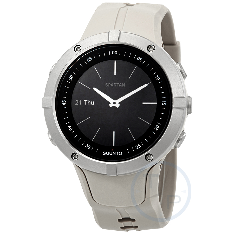 Glass fibre reinforced polyamide case with a sandstone silicone strap. Fixed steel bezel. Digital dial. Dial Type: digital. Quartz movement. Scratch resistant mineral crystal. Solid case back. Round case shape, case size: 46 x 46 mm, case thickness: 15.7 mm. Buckle clasp. Water resistant at 50 meters / 165 feet. Functions: date, day, hour, minute, second, 24/7 tracking of your daily steps, calories and sleep, heart rate zones, customizable watch faces, incoming calls, text and calendar notifications, weather, customizable sport modes, gps tracking and navigation, alarm. Additional Info: bluetooth-connected, altimeter, interval guidance during training. Suunto Spartan Trainer Wrist HR Sandstone Mens Sports Watch SS023409000.