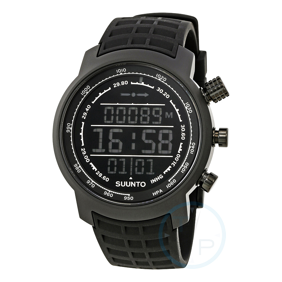 Black stainless steel case with a black silicone strap. Fixed-stainless steel bezel. Digital dial. Dial Type: digital. CR2032 quartz movement. Scratch resistant sapphire crystal. Solid case back. Case size: 44.7 mm. Round case shape. Tang clasp. Water resistant at 100 meters / 330 feet. Functions: date, day, hour, minute, second, compass, altimeter, weather. Sport watch style. Suunto Elementum Terra Digital Dial Unisex Sports Watch SS016979000.