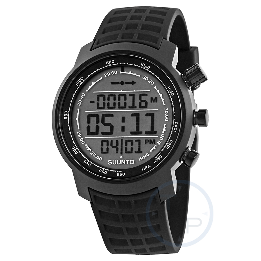 Black stainless steel case with a black silicone strap. Fixed stainless steel bezel. Digital dial. Dial Type: digital. Quartz movement. Scratch resistant sapphire crystal. Solid case back. Round case shape, case size: 45 mm, case thickness: 14.3 mm. Tang clasp. Water resistant at 100 meters / 330 feet. Functions: date, hour, minute, second, compass, altimeter, weather and alarm. Sport watch style. Suunto Elementum Terra Alarm Watch SS018732000.