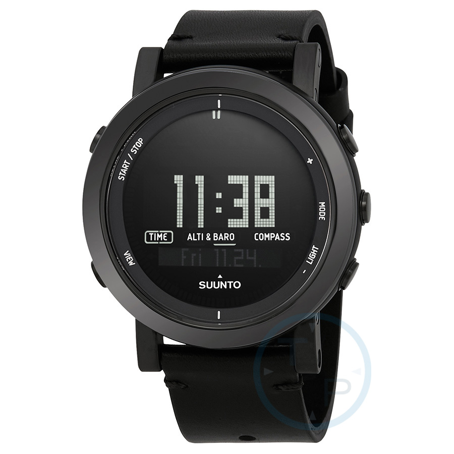 Stainless steel case with a black leather strap. Fixed ceramic bezel. Digital dial. Dial Type: digital. Quartz movement. Scratch resistant sapphire crystal. Solid case back. Round case shape, case size: 49.1 mm x 49.1 mm, case thickness: 13.4 mm. Tang clasp. Water resistant at 30 meters / 100 feet. Functions: hour, minute, date, day of the week, altimeter, barometer, compass, dual time, sunrise / sunset, temperature, storm alarm. Sport watch style. Watch label: Made in Finland. Suunto Essential Ceramic Alarm Watch SS022437000.