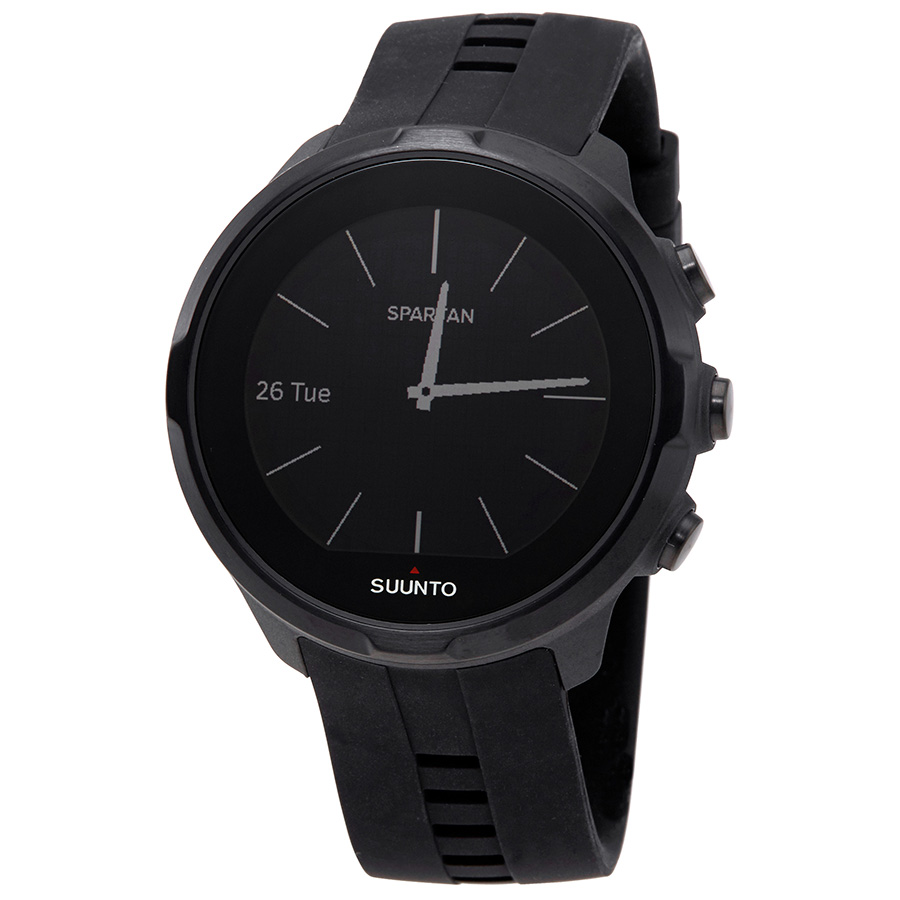 Polyamide case with a black silicone strap. Fixed stainless steel bezel. Digital dial. Dial Type: Analog-digital. Quartz movement. Scratch resistant mineral crystal. Solid case back. Case size: 50 mm x 50 mm. Case thickness: 16.8 mm. Round case shape. Functions: date, day, hour, minute, second, gps altitude, vibration alerts, gps tracking and navigation, compass, heart rate display, multiple sports log, 24/7 activity monitoring, weather. Sport watch style. Suunto Spartan HR Black Silicone Unisex Sport Watch SS022662000.
