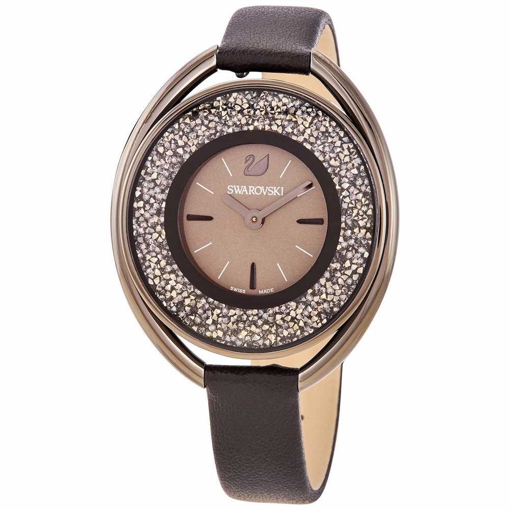 Dark grey stainless steel case with a black leather strap. Fixed silver-tone crystal set bezel. Dark grey sunray dial with grey hands and index hour markers. Dial Type: Analog. Quartz movement. Scratch resistant mineral crystal. Pull / push crown. Solid case back. Oval case shape. Case size: 37 x 43 mm. Band width: 19 mm. Pin buckle clasp. Water resistant at 30 meters / 100 feet. Functions: hour, minute. Additional Info: filled with approximately 1700 metallic light golden-tone crystals. Dress watch style. Swarovski Crystalline Quartz Ladies Watch 5158517.