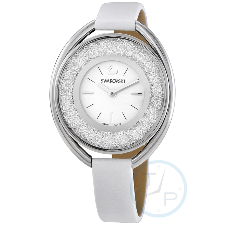 Stainless steel case with a white (calfskin) leather strap. Fixed stainless steel bezel with crystal pave. White dial with silver-tone hands and index hour markers. The Swarovski logo appears at the 12 o'clock positions. Dial Type: Analog. Quartz movement. Scratch resistant mineral crystal. Pull / push crown. Solid case back. Oval case shape. Case dimensions: 37 mm x 43 mm. Band width: 19 mm. Tang clasp. Water resistant at 30 meters / 100 feet. Functions: hour, minute. Dress watch style. Watch label: Swiss Made. Swarovski Crystalline Quartz White Dial Ladies Watch 5206145.