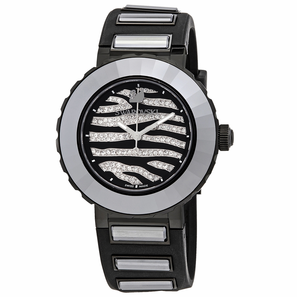 Black PVD stainless steel case with a black silicone strap with 6 jet hematite crystal inserts. Fixed silver-tone stainless steel bezel. Black (Swarovski crystal pave zebra design) dial with luminous silver-tone hands and index hour markers. Dial Type: Analog. Luminescent hands. Quartz movement. Scratch resistant mineral crystal. Pull / push crown. Solid case back. Round case shape. Case size: 39 mm. Fold over clasp with a safety release. Water resistant at 50 meters / 165 feet. Functions: hour, minute, second. Sport watch style. Watch label: Swiss Made. Swarovski Octea Zebra Design Dial Ladies Watch 5040563.