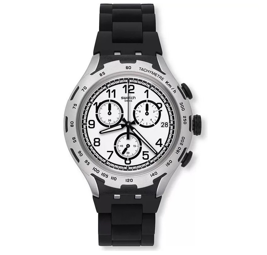 Silver-tone aluminium case with a black rubber strap. Fixed silver-tone aluminium bezel showing tachymeter markings. White dial with luminous black hands and Arabic numeral hour markers. Minute markers around the outer rim. Dial Type: Analog. Chronograph - three sub-dials displaying: 60 second, 60 minute and 1/10th of a second. Quartz movement. Scratch resistant mineral crystal. Solid case back. Round case shape. Case size: 45 mm. Case thickness: 13.57 mm. Fold over clasp with a safety release. Water resistant at 30 meters / 100 feet. Functions: chronograph, tachymeter, hour, minute, second. Archi-mix Series. Sport watch style. Swatch Archi-Mix Chronograph Quartz White Dial Mens Watch 2500596.