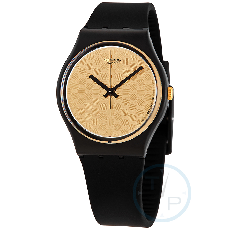 Black plastic case with a black silicone strap. Fixed black plastic bezel. Golden glimmer dial with black hands. No markers. Dial Type: Analog. Quartz movement. Scratch resistant mineral crystal. Pull / push crown. Solid case back. Round case shape. Case size: 34 mm. Case thickness: 8.75 mm. Band width: 17 mm. Tang clasp. Water resistant at 30 meters / 100 feet. Functions: hour, minute, second. Casual watch style. Watch label: Swiss. Swatch Arthur Quartz Golden Glimmer Dial Ladies Watch GB323.