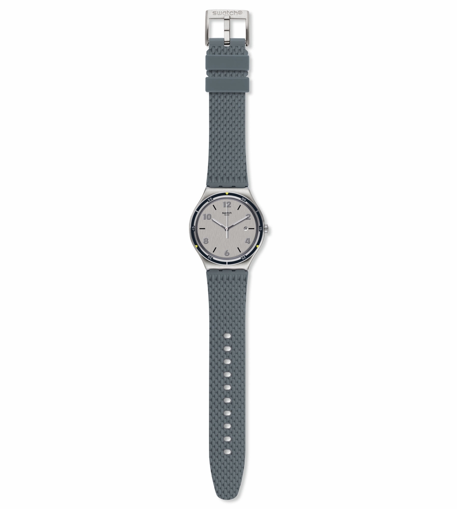 Stainless steel case with a grey rubber strap. Fixed black-plated and silver-tone bezel. Grey dial with luminous silver-tone hands and alternating Arabic numeral and index hour markers. Dial Type: Analog. Luminescent hands and markers. Quartz movement. Scratch resistant mineral crystal. Push / pull crown. Solid case back. Round case shape. Case size: 42.7 mm. Case thickness: 11.7 mm. Band width: 20 mm. Tang clasp. Water resistant at 30 meters / 100 feet. Functions: hour, minute, second. Asphaltise Series. Casual watch style. Watch label: Swiss Made. Swatch Asphaltise Quartz Grey Dial Mens Watch YWS447.