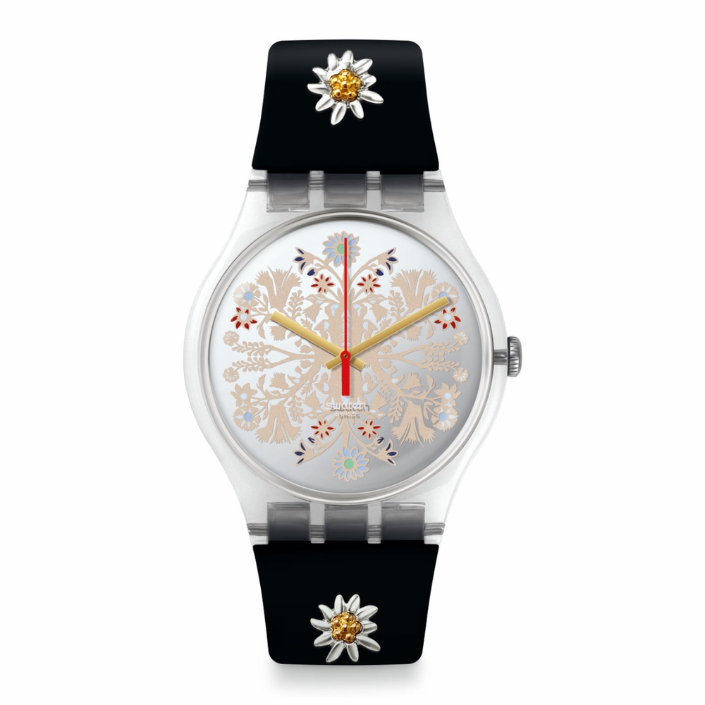 Translucent stainless steel case with a black silicone strap. Fixed translucent plastic bezel. Silver (floral pattern) dial with gold-tone hands. No markers. Dial Type: Analog. Quartz movement. Plexiglass crystal. Pull / push crown. Solid case back. Round case shape. Case size: 41 mm. Case thickness: 9.85 mm. Band width: 20 mm. Tang clasp. Water resistant at 30 meters / 100 feet. Functions: hour, minute, second. Bergstrussli Series. Casual watch style. Watch label: Swiss Made. Swatch Bergstrussli Quartz Silver Floral Pattern Dial Ladies Watch SUOK142.