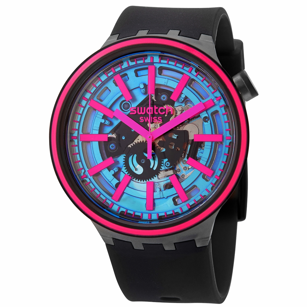 Black plastic case with a black silicone strap. Fixed black plastic bezel with a hot pink ring. Blue (transparent) dial with hot pink hands and index hour markers. Minute markers around the outer rim. Dial Type: Analog. Quartz movement. Scratch resistant plexiglass crystal. Pull / push crown. Transparent case back. Round case shape. Case size: 47 mm. Case thickness: 11.75 mm. Tang clasp. Water resistant at 30 meters / 100 feet. Functions: hour, minute, second. Big Bold Series. Casual watch style. Swatch Big Bold Quartz Blue Dial Unisex Watch SO27B111.