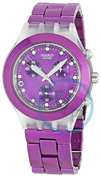 Clear plastic case with a purple aluminium band. Fixed purple aluminium bezel. Purple dial with luminous silver-tone hands and crystal hour markers. Minute markers around the outer rim. Dial Type: Analog. Luminescent hands a. Date display between 8 and 9 o'clock position. Chronograph - three sub-dials displaying: 60 minutes, 60 seconds and 1/10th of a second. Swiss ETA Quartz quartz movement. Scratch resistant plastic crystal. Octagonal-shaped crown. Solid case back. Round case shape. Case size: 43 mm. Case thickness: 12.40 mm. Band width: 21 mm. Deployment clasp. Water resistant at 30 meters / 100 feet. Functions: hours, minutes, seconds, chronograph. Sport watch style. Swatch Full Blooded Blueberry Unisex Watch SVCK4048AG.