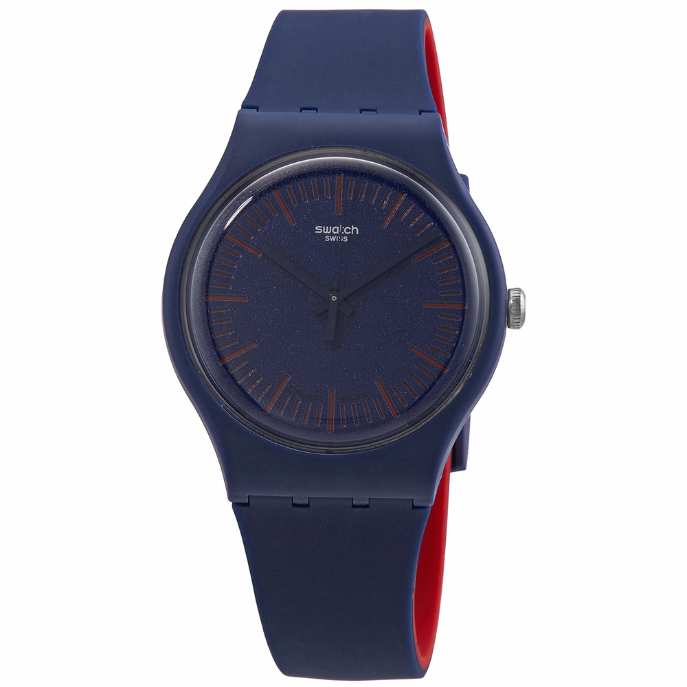 Blue plastic case with a blue (red backed) silicone strap. Fixed blue plastic bezel. Blue dial with blue hands and index hour markers. Minute markers around the outer rim. Dial Type: Analog. Quartz movement. Plexiglass crystal. Pull / push crown. Solid case back. Round case shape. Case size: 41 mm. Case thickness: 9.85 mm. Band width: 20 mm. Tang clasp. Water resistant at 30 meters / 100 feet. Functions: hour, minute, second. Bluenred Series. Casual watch style. Swatch Bluenred Quartz Blue Dial Mens Watch SUON146.