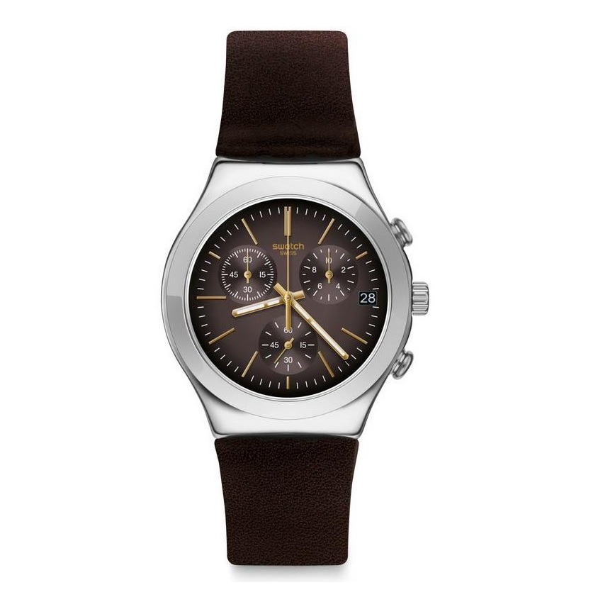 . Silver-tone stainless steel case with a brown leather strap. Fixed bezel. Brown dial with gold-tone hands and index hour markers. Minute markers around the outer rim. Dial Type: Analog. Luminescent hands. Date display at the 3 o'clock position. Chronograph - three sub-dials displaying: 60 second, 60 minute and 1/10th of a second. Quartz movement. Pull / push crown. Solid case back. Round case shape, case size: 40 mm. Buckle clasp. Water resistant at 30 meters / 100 feet. Functions: chronograph, date, hour, minute, second. Casual watch style. Swatch Brownflect Chronograph Quartz Brown Dial Mens Watch YCS600.