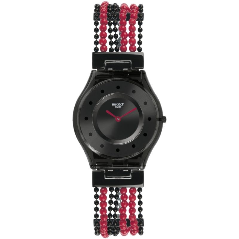 Black plastic case with a black and red (bead) plastic strap. Fixed black plastic bezel. Black dial with red hands and dot hour markers. Dial Type: Analog. Quartz movement. Plexiglass crystal. Pull / push crown. Solid case back. Round case shape. Case size: 34 mm. Band width: 17 mm. Lobster clasp. Water resistant at 30 meters / 100 feet. Functions: hour, minute. Bubble Curtain Series. Casual watch style. Watch label: Swiss Made. Swatch Bubble Curtain Quartz Black Dial Ladies Watch SFM130G.