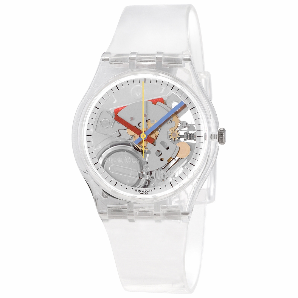 Transparent bio-sourced material case with a transparent plastic strap. Fixed silver-tone bio-sourced material bezel. Transparent see through dial with red, blue, yellow hands and index hour markers. Minute markers around the outer rim. Dial Type: Analog. Quartz movement. Scratch resistant plexi crystal. Pull / push crown. Transparent see through case back. Round case shape, case size: 34 mm, case thickness: 8.75 mm. Buckle clasp. Water resistant at 30 meters / 100 feet. Functions: hour, minute, second. Clearly Gent Series. Casual watch style. Swatch Clearly Gent Quartz Mens Watch SO28K100.