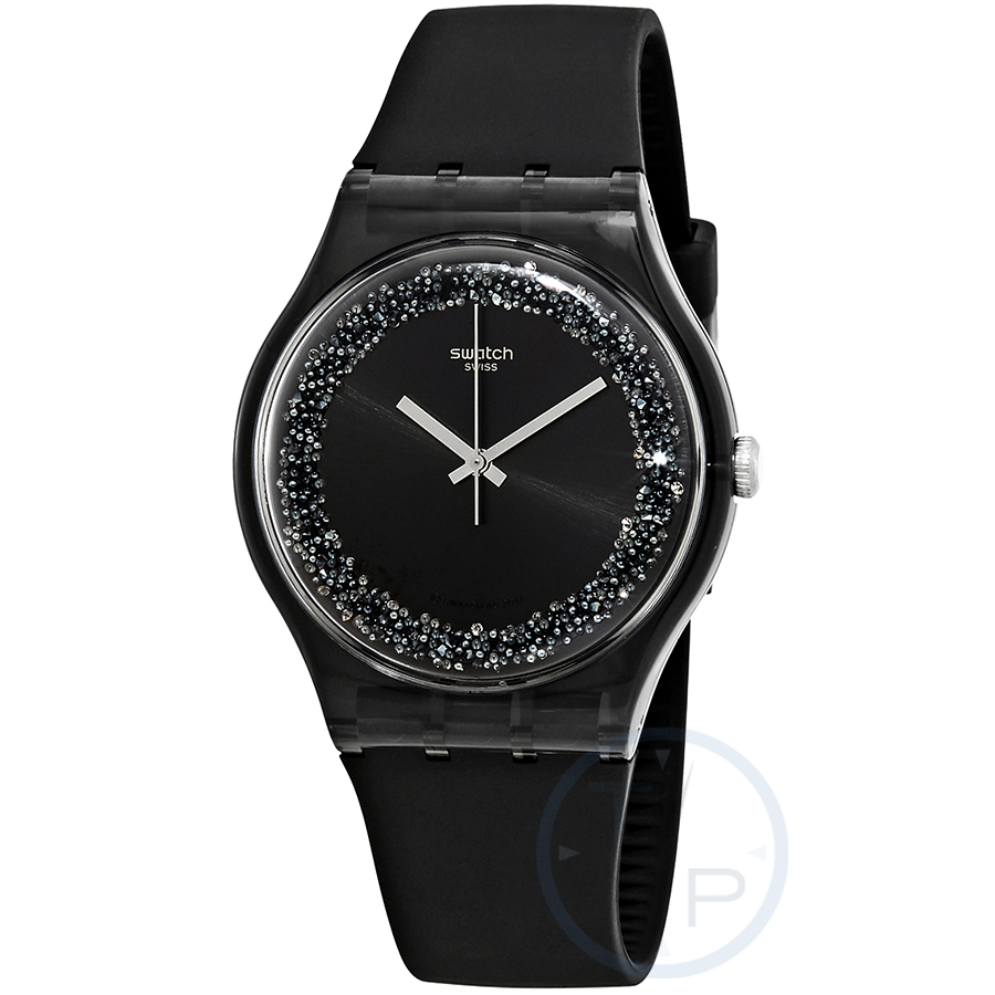 Black plastic case with a black silicone strap. Fixed translucent plastic bezel. Black (set with black stone) dial with silver-tone hands. No markers. Dial Type: Analog. Quartz movement. Plexiglass crystal. Pull / push crown. Solid case back. Round case shape. Case size: 41 mm. Case thickness: 9.85 mm. Band width: 19 mm. Tang clasp. Water resistant at 30 meters / 100 feet. Functions: hour, minute, second. Dress watch style. Swatch Darksparkles Black Dial Black Silicone Ladies Watch SUOB156