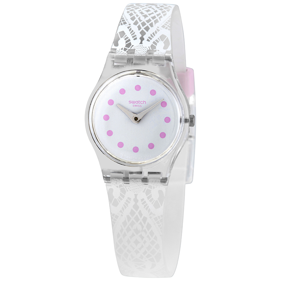 Transparent plastic case with a transparent silicone strap. Fixed plastic bezel. White dial with silver-tone hands and dot hour markers. Dial Type: Analog. Quartz movement. Scratch resistant mineral crystal. Pull / push crown. Transparent case back. Round case shape, case size: 25 mm, case thickness: 7 mm. Buckle clasp. Water resistant at 30 meters / 100 feet. Functions: hour, minute. Casual watch style. Swatch Dentellina Quartz White Dial Ladies Watch LK394.