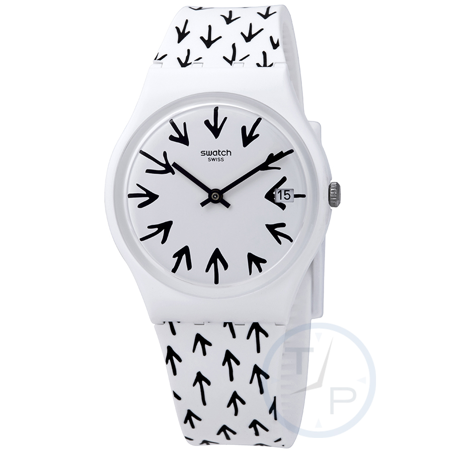 White plastic case with a white silicone (black arrow) strap. Fixed transparent plastic bezel. White (black arrow) dial with black hands and index hour markers. Dial Type: Analog. Date display at the 3 o'clock position. Quartz movement. Plexiglass crystal. Pull / push crown. Solid case back. Round case shape. Case size: 34 mm. Case thickness: 8.75 mm. Band width: 16 mm. Tang clasp. Water resistant at 30 meters / 100 feet. Functions: date, hour, minute. Casual watch style. Watch label: Swiss Made. Swatch Frechia White Dial White Silicone Ladies Watch GW409.