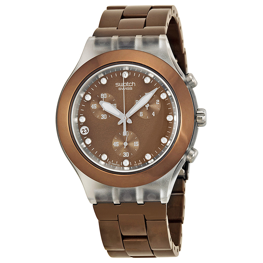 Transparent plastic case with a brown PVD stainless steel bracelet. Fixed brown aluminium bezel. Brown dial with luminous silver-tone hands and crystal hour markers. Minute markers around the outer rim. Dial Type: Analog. Luminescent hands and markers. Date display between 8 and 9 o'clock position. Chronograph - three sub-dials displaying: 60 second, 60 minute and 1/10th of a second. Quartz movement. Scratch resistant mineral crystal. Pull / push crown. Solid case back. Round case shape. Case size: 43 mm. Case thickness: 13 mm. Band width: 22 mm. Fold over clasp. Water resistant at 30 meters / 100 feet. Functions: hours, minutes, seconds, chronograph. Fw2009 Series. Casual watch style. Swatch Irony Diaphane Chrono Full Blooded Earth Watch SVCK4042AG.
