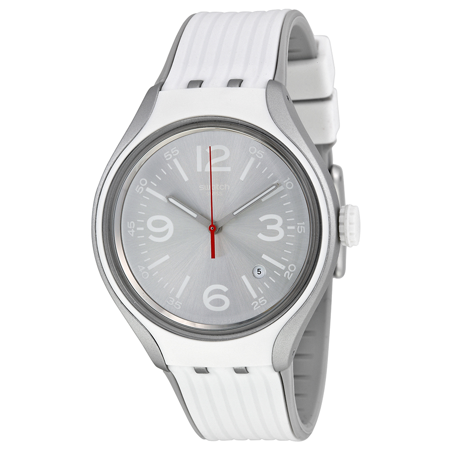 Aluminium case with a white silicone strap. Fixed aluminium bezel. Silver dial with silver-tone hands and index hour markers. Arabic numerals mark the 3, 6, 9 and 12 o'clock positions. Arabic numeral minute markers (at 5 minute intervals). Minute markers around the outer rim. Dial Type: Analog. Luminescent hands. Date display between the 4 and 5 o'clock position. Quartz movement. Plexiglass crystal. Pull / push crown. Solid case back. Round case shape. Case size: 41 mm. Case thickness: 12 mm. Band width: 21 mm. Band length: 7.5 inches. Tang clasp. Water resistant at 30 meters / 100 feet. Functions: date, hour, minute, second. Go Dance Series. Sport watch style. Swatch Go Dance Quartz Silver Dial Mens Watch 2400660.