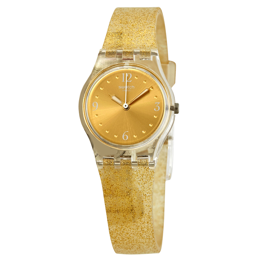 Transparent plastic case with a gold transparent (glitter) silicone strap. Fixed transparent plastic bezel. Yellow dial with luminous gold-tone hands and dot hour markers. Arabic numerals mark the 3, 6, 9 and 12 o'clock positions. Dial Type: Analog. Luminescent hands. Quartz movement. Plexiglass crystal. Pull / push crown. Transparent case back. Round case shape. Case size: 25 mm. Case thickness: 7 mm. Band width: 15 mm. Tang clasp. Water resistant at 30 meters / 100 feet. Functions: hour, minute, second. Casual watch style. Swatch Golden Glistar Too Ladies Watch LK382.