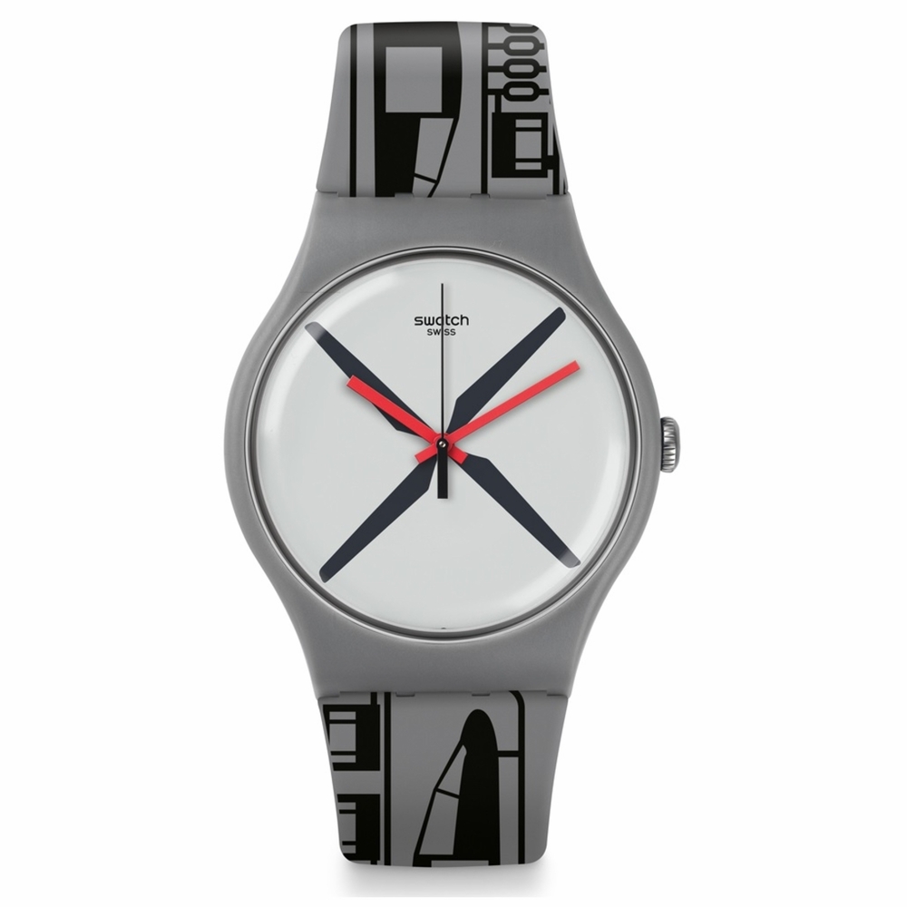 Grey plastic case with a grey silicone strap. Fixed grey plastic bezel. Grey dial with red hands. No markers. Dial Type: Analog. Quartz movement. Plexiglass crystal. Pull / push crown. Solid case back. Round case shape. Case size: 41 mm. Case thickness: 9.85 mm. Band width: 22 mm. Tang clasp. Water resistant at 30 meters / 100 feet. Functions: hour, minute, second. Casual watch style. Swatch Helikit Quartz Grey Dial Mens Watch SUOM107.