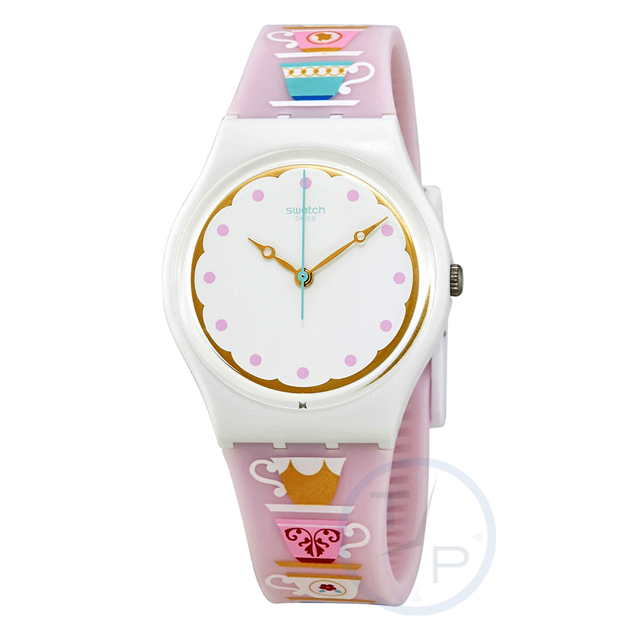 White plastic case with a pink silicone (with pastel tea cups) strap. Fixed white plastic bezel. White (golden rim) dial with gold-tone hands and dot hour markers. Dial Type: Analog. Quartz movement. Scratch resistant plexiglass crystal. Pull / push crown. Solid case back. Round case shape. Case size: 34 mm. Case thickness: 8.75 mm. Band width: 17 mm. Tang clasp. Water resistant at 30 meters / 100 feet. Functions: hour, minute, second. Casual watch style. Watch label: Swiss Made. Swatch High Tea Quartz Ladies Watch GW191.