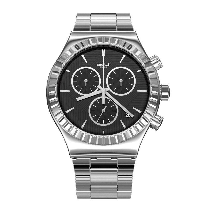 Stainless steel case with a stainless steel bracelet. Fixed stainless steel bezel. Black dial with silver-tone hands and index hour markers. Dial Type: Analog. Date display between the 4 and 5 o'clock positions. Quartz movement. Scratch resistant mineral crystal. Pull / push crown. Solid case back. Round case shape. Case size: 42 mm. Case thickness: 12.7 mm. Band width: 21 mm. Fold over clasp with a push button release. Water resistant at 30 meters / 100 feet. Functions: chronograph, date, hour, minute, second. Joe's Smile Series. Casual watch style. Swatch Joes Smile Chronograph Quartz Black Dial Watch YVS471G.