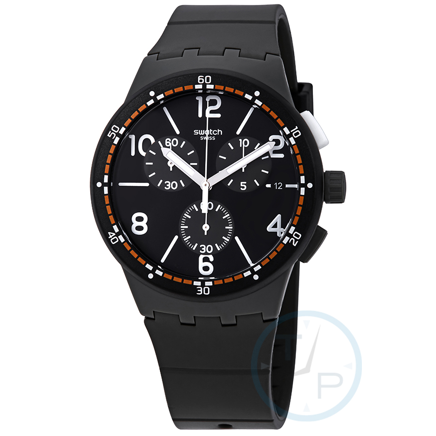 Grey plastic case with a grey silicone strap. Fixed black bezel. Grey dial with silver-tone hands and Arabic numeral and index hour markers. Minute markers around the outer rim. Dial Type: Analog. Date display at the 3 o'clock position. Chronograph - three sub-dials displaying: 60 second, 60 minute and 1/10th of a second. Quartz movement. Solid case back. Round case shape, case size: 42 mm, case thickness: 14.03 mm. Buckle clasp. Water resistant at 30 meters / 100 feet. Functions: chronograph, date, hour, minute, second. Casual watch style. Watch label: Swiss Made. Swatch K-Ki Chronograph Grey Dial Mens Watch SUSM405.