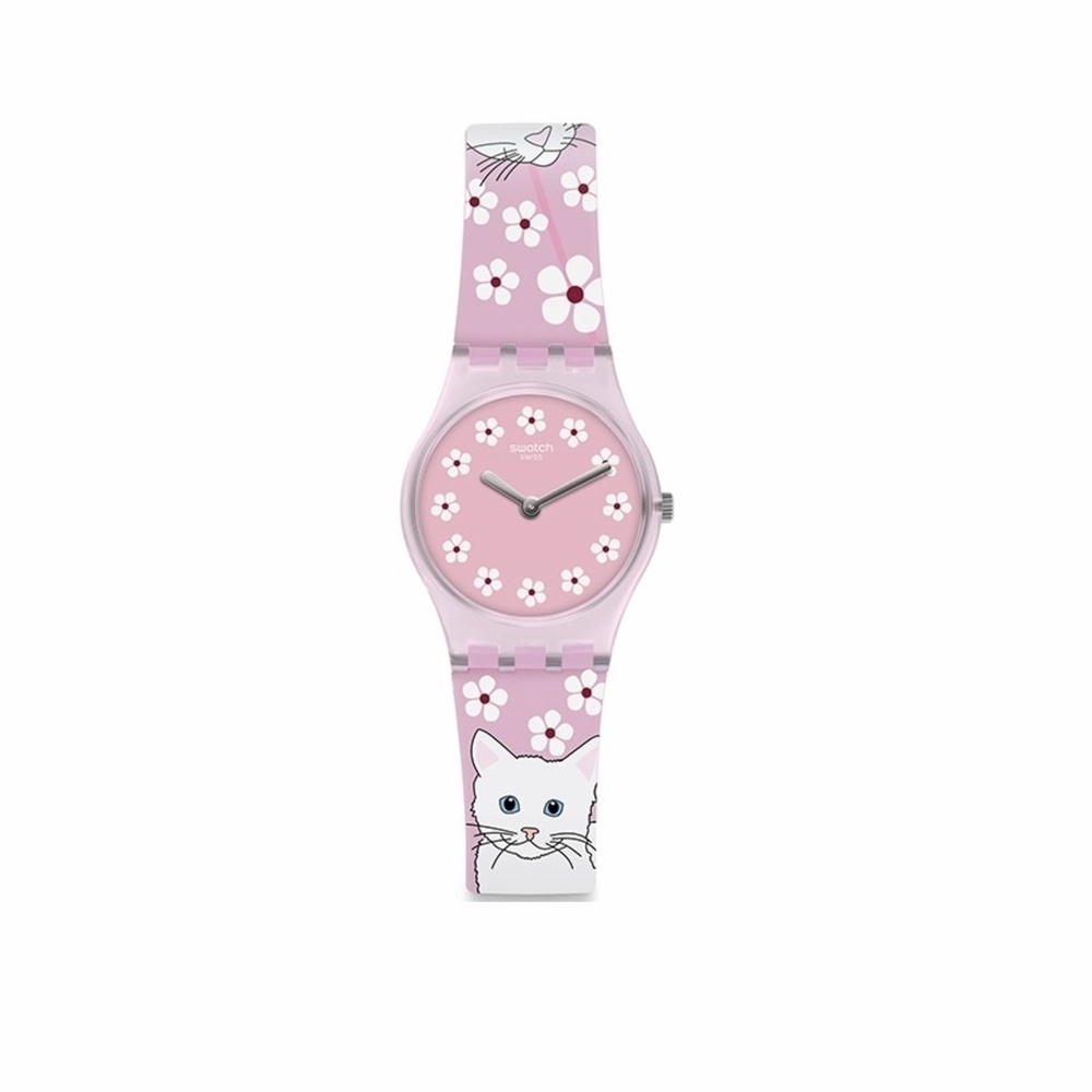 Pink plastic case with a pink (floral print) (minou cat) silicone strap. Fixed pink plastic bezel. Pink dial with silver-tone hands and floral hour markers. Dial Type: Analog. Quartz movement. Plexiglass crystal. Pull / push crown. Translucent case back. Round case shape. Case size: 25 mm. Case thickness: 7 mm. Band width: 12 mm. Tang clasp. Water resistant at 30 meters / 100 feet. Functions: hour, minute. Additional Info: flowers on the dial and strap decorated with three white cats. Fashion watch style. Swatch Ladies Minou Minou Cats Quartz Pink Dial Watch LP156.