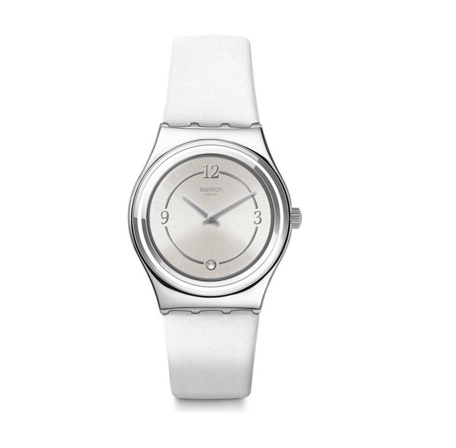 Grey stainless steel case with a white leather strap. Fixed bezel. Grey dial with silver-tone hands and Arabic numeral at the 3, 9 and 12 o'clock positions hour markers. Dial Type: Analog. Quartz movement. Scratch resistant mineral crystal. Pull / push crown. Round case shape, case size: 33 mm. Buckle clasp. Water resistant at 30 meters / 100 feet. Functions: hour, minute. Casual watch style. Swatch Madame Blanchette Ladies Watch YLS213.