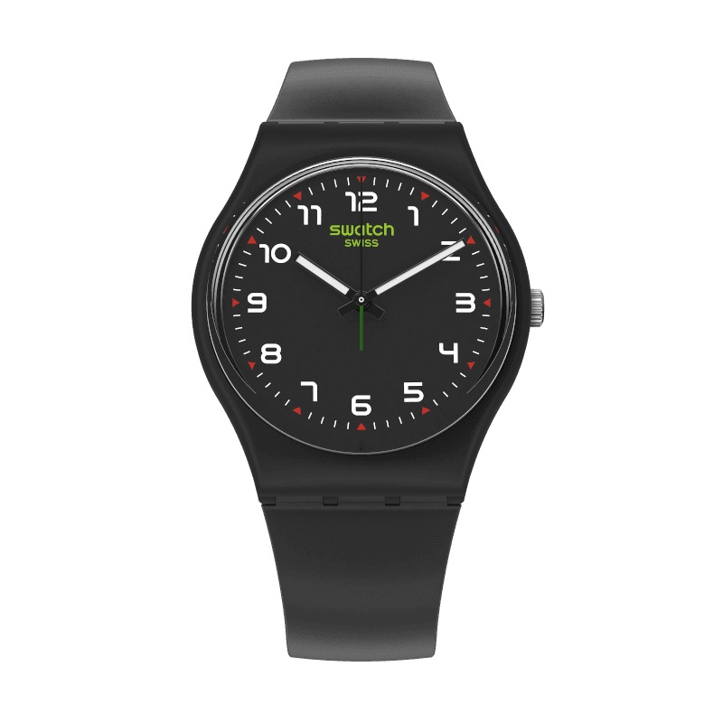 Black (bio-sourced) plastic case and strap. Fixed black (bio-sourced) plastic bezel. Black dial with luminous black hands and Arabic numeral hour markers. Dial Type: Analog. Luminescent hands and markers. Quartz movement. Scratch resistant plexiglass crystal. Pull / push crown. Solid case back. Round case shape, case size: 34 mm, case thickness: 8.75 mm. Band width: 18 mm. Tang clasp. Water resistant at 30 meters / 100 feet. Functions: hour, minute, second. Masa Series. Casual watch style. Swatch MASA Quartz Black Dial Mens Watch SO28B100.