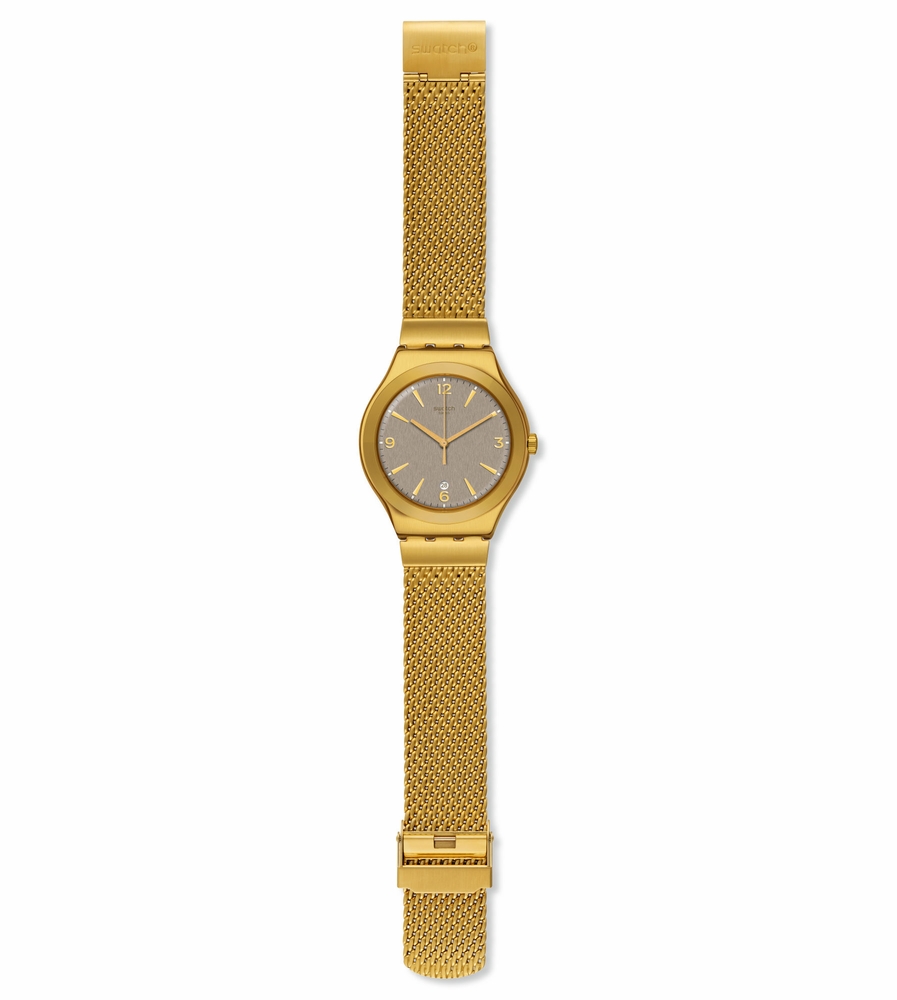 Gold PVD stainless steel case with a gold PVD stainless steel mesh bracelet. Fixed gold PVD bezel. Yellow dial with gold-tone hands and index hour markers. Arabic numerals appear at the 3, 6, 9 and 12 o'clock positions. Minute markers around the outer rim. Dial Type: Analog. Date display above the 6 o'clock position. Quartz movement. Plexiglass crystal. Pull / push crown. Solid case back. Round case shape. Case size: 42.7 mm. Case thickness: 11.7 mm. Fold over slip through clasp. Water resistant at 30 meters / 100 feet. Functions: date, hour, minute, second. Mesh O'honey Series. Casual watch style. Watch label: Swiss Made. Swatch Mesh OHoney Quartz Yellow Dial Mens Watch YWG409M.