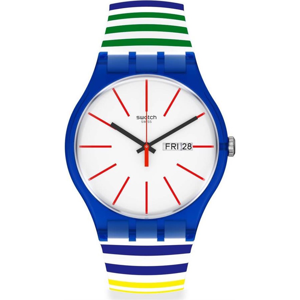 Blue (translucent) plastic case with a white multicolor striped silicone strap. Fixed blue (translucent) plastic bezel. White dial with black hands and index hour markers. Dial Type: Analog. Day of the week and date display at the 3 o'clock position. Quartz movement. Plexiglass crystal. Pull / push crown. Translucent case back. Round case shape. Case size: 41 mm. Case thickness: 10 mm. Band width: 19.7 mm. Tang clasp. Water resistant at 30 meters / 100 feet. Functions: date, hour, minute, second. Monthly Drops Home Stripe Home Series. Casual watch style. Watch label: Swiss Made. Swatch Monthly Drops Home Stripe Home Quartz White Dial Watch SUON715.