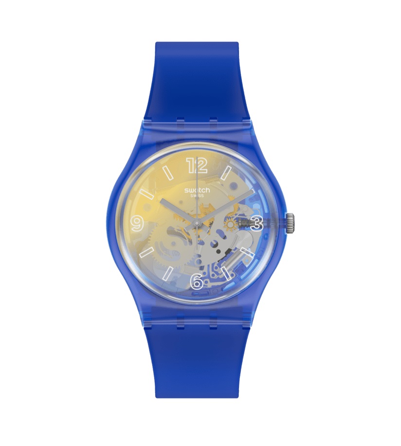Blue (transparent) plastic case with a blue silicone strap. Fixed blue (transparent) plastic bezel. Transparent (skeleton) dial with silver-tone hands and index hour markers. Arabic numeral marker appears at the 3, 6, 9 and 12 o'clock positions. Dial Type: Analog. Quartz movement. Plexiglass crystal. Pull / push crown. Transparent case back. Round case shape. Case size: 34 mm. Case thickness: 8.75 mm. Tang clasp. Water resistant at 30 meters / 100 feet. Functions: hour, minute, second. Monthly Drops Series. Casual watch style. Swatch Monthly Drops Quartz Transparent Dial Unisex Watch GN278.