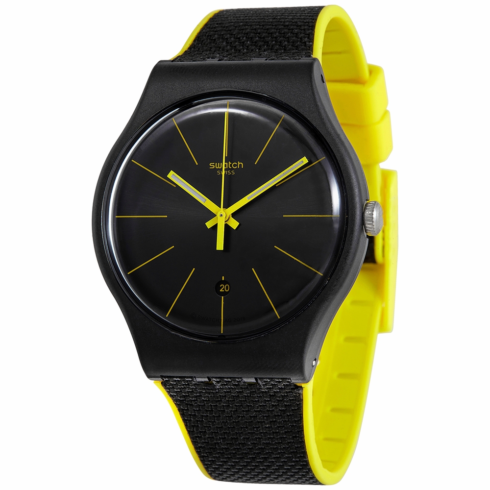 Black plastic case with a black and yellow silicone strap. Fixed black plastic bezel. Anthracite dial with yellow hands and index hour markers. Quartz movement. Scratch resistant plexiglass crystal. Pull / push crown. Solid case back. Round case shape. Case dimensions: 41 mm x 47 mm. Case thickness: 9.85 mm. Band width: 19.7 mm. Yellow plastic tang clasp. Water resistant at 30 meters / 100 feet. Functions: hour, minute, second. Night Cord Series. Casual watch style. Swatch Night Cord Quartz Anthracite Dial Watch SUOB406.