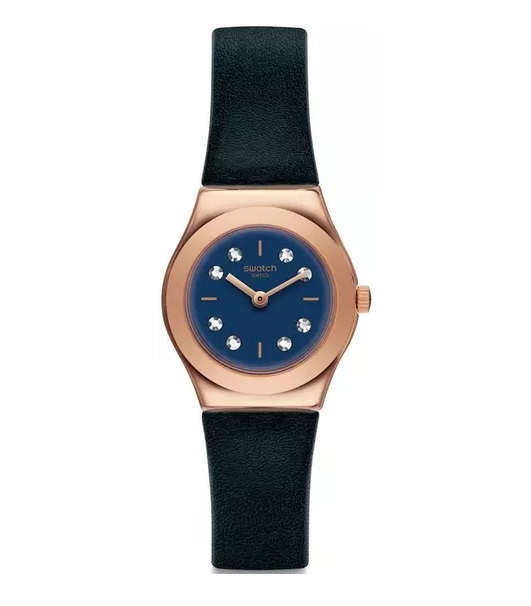 Rose gold-tone stainless steel case with a black leather strap. Fixed rose gold-tone bezel. Blue dial with rose gold-tone hands and crystal hour markers. Indexmarkers at the 3, 6, 9 and 12 o'clock positions. Dial Type: Analog. Quartz movement. Plexiglass crystal. Pull / push crown. Solid case back. Round case shape. Case size: 25 mm. Case thickness: 8 mm. Band width: 12 mm. Tang clasp. Water resistant at 30 meters / 100 feet. Functions: hour, minute. Oro-loggia A Gala Night Series. Casual watch style. Watch label: Swiss Made. Swatch Oro-loggia A Gala Night Quartz Crystal Blue Dial Ladies Watch YSG152.